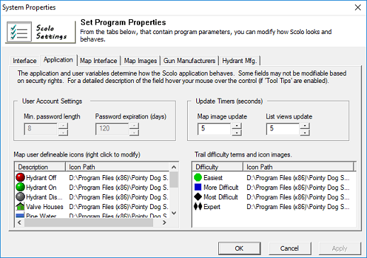 Most of the values here are not modifiable but are included for reference with the exception of the Update Timers. Min. password length: The minimum length of a user password within Scolo. Password expiration: The default number of days a user’s password will expire and be prompted to be changed. Map image update: The interval time in number of seconds that dynamic values in a map screen are updated with new values from the database. List views update: The interval time, in seconds, that the values in a grid type screen are updated with new values. Map icons: The icons used for specific objects and their state in the map views. Trail difficulty icons: The display names and icons to be displayed for trails. |