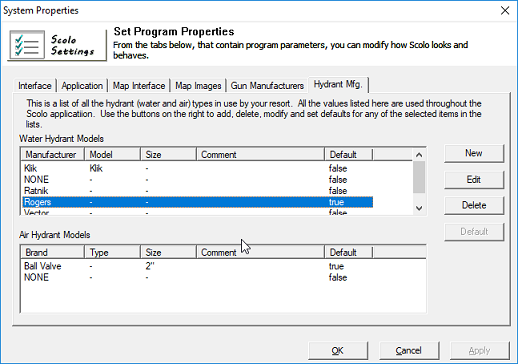 This control is where you setup all the hydrants that your resort uses and what Scolo uses for options when creating and modifying hydrant objects. When you click on either of the lists the buttons on the left will become enabled depending on what is selected. You can create a new hydrant type, edit an existing record or delete an unused type from the database. You can also select a default value which will become the selected type when creating new hydrant objects. You need be an Administrator, System Manager or System Configurator in order to modify any of the values here. |