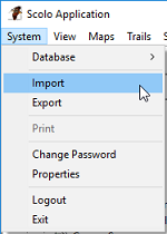 If you selected ‘Install Sample Project’ during the installation, you can import that project to populate Scolo to demonstrate some of the application’s features while in Demo Mode. This section will guide you through how to import that sample project. First you need run the Import command from the main menu. The Import is under System menu item.