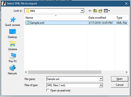 You then need to select the sample project XML file. Click the Browse button at the bottom right of this screen. You then get a browse dialog for selecting the file. The Scolo’s default directory for data should contain a file named ‘Sample.xml’. Select this file and then click the Open button to go back to the last selection screen.
