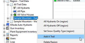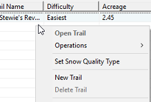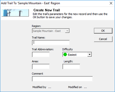 You are then given a window for entering the information pertaining to this trail. Region: Depending on the method you use above, you might be able to select what region to add the trail to. This control might be disabled. Trail Name: A unique trail name that will be displayed in the application. Trail Abbreviation: This value is used as a prefix for the hydrants added to this trail. It must be unique to the project so you might need to use three (3) or more characters. Some pre-planning on this might prove to be helpful. Trail Difficulty: This is the icon that the main window will display with the trail. Area: The surface area of the trail in whatever unit of measurement you would like. This value is not used anywhere in the application but might be useful for custom reporting. Length: The length of the trail in whatever unit of measurement you would like. Like area this is not used by Scolo’s default logic but might be useful for custom reporting. Comment: This field is used for tooltip pop-up messages if you would like add something. These values can be modified later by double clicking on a trail name in the navigation window or selecting the ‘Trail Properties’ right click menu item. Use the OK button to save your changes or Cancel to exit without saving. |