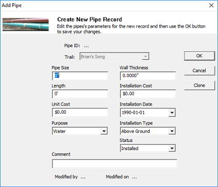 Trail: The trail that this pipe is located on. This control is disabled and set by the trail selected when running the command above. Pipe Size: The diameter of the pipe. Length: The length of the pipe line. Wall Thickness: Wall thickness of the pipe. Installation Cost: The installation cost for the pipe line. Unit Cost: The price per foot when purchased. Installation Date: The installation date for the pipe. Purpose: Is this an air, water or other line type? Installation Type: Is the pipe buried, above ground or mixed (both)? Status: Operation status of the pipe. Comment: This field is used for noting anything you would like about this record. These values can be modified later by selecting the ‘Pipe Properties’ right click menu item or double clicking on the pipe record in the main window. Use the OK button to save your changes or Cancel to exit without saving. |