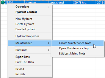 You need to have Administrator, System Manager, System Configurator or System Operator privileges to use access these commands. Disable Hydrant Selecting this status for a hydrant will flag it as down and will visually indicate that by changing its icon. Maintenance Notes From the Maintenance menu commands you can create, edit and review all maintenance records for the selected hydrant. This allows for required items from the field to be communicated to the system operators for record keeping and work ticket generation through reporting.