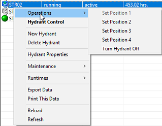 You need to have Administrator, System Manager, System Configurator or System Operator privileges to use access these commands. hNode Auto Hydrant Operations If the hydrant has a hNode hydrant controller attached and configured, the hydrant operations are different. You can change the hydrant position and turn it off using these commands.