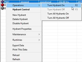 Hydrant and gun status are a large part of what Scolo is for. Whether it is manually controlling status or operating our hNode automatic controllers through Scolo’s interface, trail and hydrant runtimes are calculated for resort operators to be able to see what their snowmaking assets are up to. Where and what is operating as well as access to historical information. From the grid views or maps, the interface is made for quick manipulation of hydrant status and viewing. The following describes the command available for hydrants. The menus shown are available by right clicking on a hydrant in the main window. Manual Hydrant Operations For manual hydrant status manipulation, you can turn the selected hydrant on/off or turn all the hydrants on in the currently selected view. The F2 key will turn a hydrant’s status to ‘On’ just by clicking or using the up/down keys through a list of hydrants.