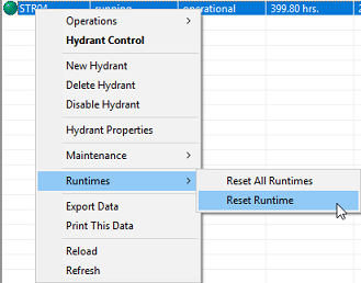 You need to have Administrator, System Manager, System Configurator or System Operator privileges to use access these commands. Runtime Reset Hydrant runtimes can be reset for individual hydrants or all the hydrants in the current view. If you wish to seasonally reset the runtimes for all of your hydrants, you would use the ‘All Hydrants’ navigation menu item and then select the ‘Reset All Runtimes’ command.